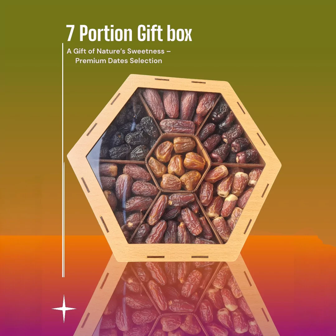 Experience luxury in every bite with our Khajoor (Dates) 7 Portion Large Box presented in an elegant dark brown hexagon box. This premium selection features a rich assortment of chocolate-coated dates, Sukri dates, Ajwa Jambo, and Mabroom dates, carefully portioned for a refined presentation.